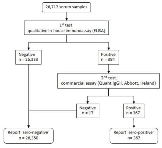 Blood samples (3–5 mL) were separated into serum samples with cold chains, and aliquots were placed into two microtubes: one for SARs-CoV-2 antibody testing and another for back up. All the specimens were kept at −20 °C until laboratory testing was performed.