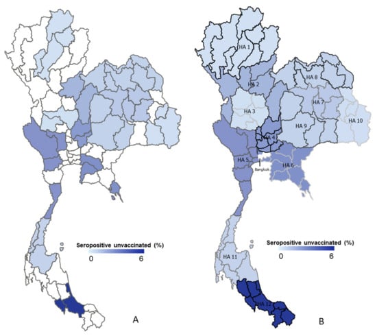 Mapping 13 public health areas and seropositive distributions in Thailand. (A) The random province sites around Thailand that show each HA (see Appendix A Table A1). (B) The density of seropositivity in each area of public health, which ranges from 0% to 6% seropositivity, is demonstrated by a choropleth map. HA, health area.