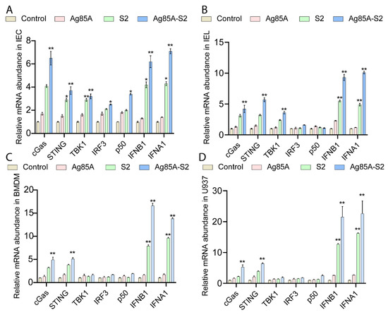 Ag85a-S2 upregulates the mRNA abundance of key components in the cGAS-STING signaling pathway both in vivo and in vitro. (A,B) A total of 20 mice in each group were orally administered with PBS (control), S2, Ag85a, or Ag85a-S2. IECs and IELs were isolated after last immunization. mRNA expression levels of cGAS key components were detected in IEC (A) and IEL (B) by RT-qPCR. IECs and IELs were obtained two months post-oral administration. (C,D) BMDM (C) or U937 (D) cells were stimulated with PBS (control), S2, Ag85a, or Ag85a-S2 for 4 h, and transcripts levels were measured by RT-qPCR. mRNA levels were normalized to the control group. GAPDH was used as the reference gene for normalization. Data are presented as mean ± S.E.M. of three independent experiments. Post hoc test in ANOVA was used to calculate the significance between control, S2, Ag85a, and Ag85a-S2 group. *, p < 0.05; **, p < 0.01.