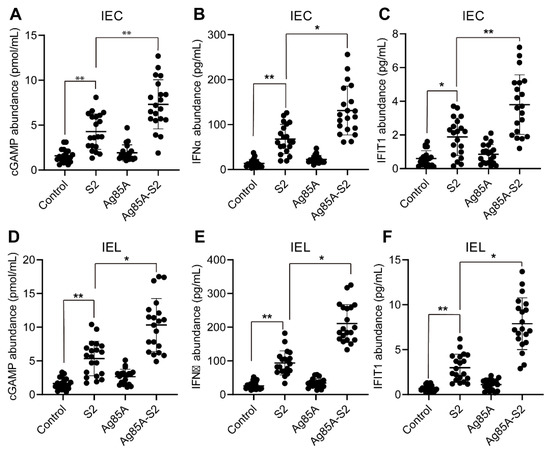 cGAS-STING downstream targets are significantly upregulated upon Ag85a-S2 treatment. (A–F) The downstream targets regulated by cGAS-STING were measured by ELISA. Twenty mice in each group were orally administered with PBS (control), S2, Ag85a, or Ag85a-S2. IEC (A–C) and IEL (D–F) cells were collected and subjected to ELISA. The cGAMP (A,D), IFNα (B,E), and IFIT1 (C,F) in the cell lysates from IEC (A–C) and IEL (D–F) were measured. *, p < 0.05; **, p < 0.01, one-way ANOVA Friedman test with Dunn’s multiple comparisons post-test.