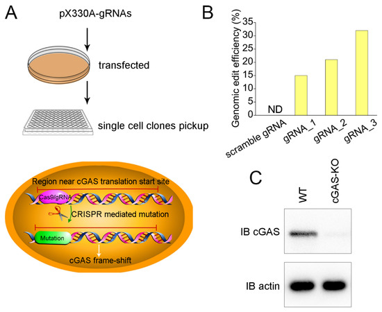 Construction of cGAS knockout Caco-2 cells by CRISPR. (A) Schematic presentation of CRISPR-mediated point mutation. Cells were transfected with a pX330 plasmid encoding gRNAs targeting the region near cGAS translation and spCas9. Single-cell colonies were picked up for Sanger sequencing validation. (B) Detection of cutting efficiency of different gRNA. Caco-2 cells were transfected with pX330A plasmids encoding different gRNAs and spCas9. Genomic DNA was extracted, and the genomic regions containing the cutting sites were PCR amplified and subjected to T7 endonuclease I assay. (C) The single-cell colony carrying homozygous deletion of cGAS (cGAS-KO) was verified by Western blotting. N.D.—not detected.