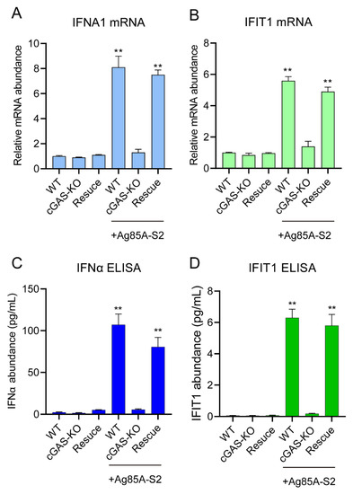 Furthermore, we stimulated wild-type, cGAS-KO, and rescued cell lines (i.e., cGAS-KO cell lines transduced by full-length cGAS) with Ag85a-S2 and simultaneously analyzed the protein and transcript levels of IFNα and IFIT1. We showed that Ag85a-S2 stimulation significantly increased the protein and transcript levels of IFNα and IFIT1 in the wild-type cells (Figure 4A–D) but failed to increase the protein and transcript levels of IFNα and IFIT1 in the cGAS-KO cells (Figure 4A–D). In addition, we rescued the cGAS-KO cell with full-length cGAS. The rescue procedures did not alter the protein and transcript levels of IFNα and IFIT under the resting state but significantly upregulated the expression of IFNα and IFIT1 upon Ag85a-S2 stimulation (Figure 4A–D).