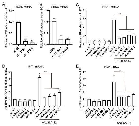 Silencing of cGAS or STING inhibited the immune response triggered by Ag85a-S2. (A–D) Naïve IECs were transfected with 10 nM siRNA duplexes against cGAS or STING; 72 h post-transfection, naïve IECs were stimulated with Ag85a-S2 for 24 h. The relative mRNA level of cGAS (A), STING (B), IFNA1 (C), IFIT1 (D), and IFNB (E) was quantified. Gapdh was used as the housekeeping gene. Data are presented as mean ± S.E.M. of three independent experiments. ** p < 0.01; *, p < 0.01, one-way ANOVA Friedman test with Dunn’s multiple comparisons post-test.