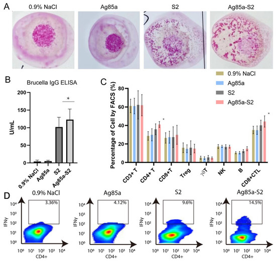 Brucella are generally regarded as intracellular pathogens. Protection against intracellular bacteria requires long-lasting immune responses and adaptive cellular immunity. The Rose Bengal test is a rapid agglutination reaction using Brucella as a bacterial suspension, stained with Rose Bengal in a buffered acid medium. After mixing equal parts of Rose Bengal antigen and serum, the appearance of colored agglutinations is observed in the case of brucellosis. The sensitivity limit is 25 IU/mL. The test highlights IgG and is positive later (2 to 3 weeks), and the sensitivity of the technique is at least 95%. Thus, we used the Rose Bengal test (RBT) to detect the anti-Brucella antibody in the mice serums stimulated with Ag85a, Ag85a-S2, S2, and 0.9% NaCl. As shown in Figure 6A, both S2 and Ag85a-S2 showed positive results. We further applied ELISA to quantify the Brucella-specific IgG level. As shown in Figure 6B, the IgG level in the Ag85a-S2 and S2 groups were significantly higher than the Ag85a and 0.9% NaCl group. Although Brucella-specific antibodies have been shown to have a limited role during Brucella infection, we indeed observed a mild (less than 10%) upregulation of Brucella-specific IgG level in Ag85a-S2 compared to that in S2 (Figure 6B).