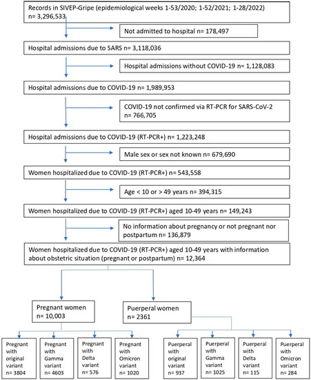 In this study, the database was searched for records from 17 February 2020 to 16 July 2022 (epidemiological weeks 8–53 in 2020; 1–52 in 2021; and 1–28 in 2022), as the first Brazilian records began in epidemiological week 8 of 2020 (symptom onset for the first confirmed case of COVID-19 in Brazil occurred on 17 February 2020) [22]. The search included all records of obstetric patients aged 10 to 49 years who were hospitalized with COVID-19 (confirmed using RT-PCR for SARS-CoV-2) (Figure 1). A total of 12,364 women were divided into two groups: pregnant (n = 10,003) and puerperal (n = 2361). Each group was subdivided based on the dominant VOCs in Brazil at the time of diagnosis: original, Gamma, Delta, and Omicron. Dominance occurs when more than 50% of cases are related to a particular variant. The Gamma variant was considered dominant from 1 February 2021 to 31 July 2021, the Delta variant from 1 August 2021 to 31 December 2021, and the Omicron variant from 1 January 2022 to 16 July 2022 [13]. Vaccination of pregnant and postpartum patients began in May 2021 in Brazil, during the dominance of the Gamma variant [18]. Therefore, patients in the Gamma, Delta, and Omicron subgroups were also divided based on the vaccination status. Only valid responses of the analyzed variable were considered. The tables of analyses show the number of valid observations for each variable. Variables used in the analysis were age, skin color or ethnicity, level of education, comorbidities, signs and symptoms, ICU admissions, invasive respiratory support requirement, and outcome (death). The reported comorbidities included chronic cardiovascular disease, asthma, obesity, and diabetes. The reported signs and symptoms included fever, cough, sore throat, dyspnea, respiratory discomfort, SpO2 < 95% on room air, diarrhea, vomiting, abdominal pain, fatigue, anosmia, and ageusia.