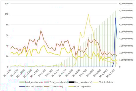 Regarding the mental illness related to COVID-19, we used the search terms “COVID anxiety”, “COVID depression”, “COVID-19 delta”, “COVID-19 omicron”, “total cases”, “new cases”, and “total vaccination” to document a dominant information for the population during the prevalence of two different risky variants of COVID-19: Delta and Omicron. The Pearson correlations were calculated for these seven terms from 23 August 2020 to 23 November 2021. Further search terms of “Pfizer/BNT COVID vaccine”, “Moderna COVID vaccine”, “AstraZeneca COVID vaccine”, “total cases”, “new cases”, and “total vaccination” can document the dominant information needed for individuals to protect themselves by vaccine. The Pearson correlations were calculated for these six terms. Finally, we used the search terms “Anxiety”, “Depression”, “COVID-19 vaccine”, “total cases”, “new cases”, and “total vaccination” to document the dominant information regarding mental illness available for the population to search in conjunction with COVID-19 vaccine information. The Pearson correlations were calculated for these six terms from August 2020 to December 2021.
