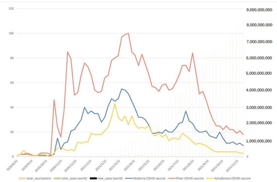 Display of Google Trend data for three major COVID-19 vaccines, including the Moderna vaccine, Pfizer/BNT vaccine, and AstraZeneca vaccine, as well as for total and new COVID-19 cases. Normalized search data were obtained from Google Trend (100—high interest; 0—no or insufficient interest data) for the period from 23 August 2020 to 5 December 2021. COVID-19 case data were from JHU (John Hopkins University) CSSE COVID-19 Data (accessed on 5 December 2020).