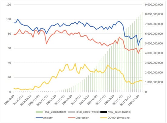 Display of Google Trend data for COVID-19 vaccines, anxiety, and depression as well as for total and new COVID-19 cases. Normalized search data were obtained from Google Trend (100—high interest; 0—no or insufficient interest data) for the period from 23 August 2020 to 5 December 2021. COVID-19 case data were from JHU (John Hopkins University) CSSE COVID-19 Data (accessed on 5 December 2020).