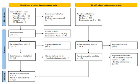 - Page, M.J.; McKenzie, J.E.; Bossuyt, P.M.; Boutron, I.; Hoffmann, T.C.; Mulrow, C.D.; Shamseer, L.; Tetzlaff, J.M.; Akl, E.A.; Brennan, S.E.; et al. The PRISMA 2020 Statement: An Updated Guideline for Reporting Systematic Reviews. BMJ 2021, 372, n71. [Google Scholar] [CrossRef]