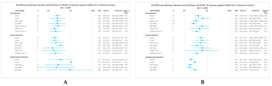 For symptomatic infection, cohort and case-control subgroups also showed significant results with VEDs of 24% (95%CI 21% to 26%) and 13% (95%CI 7% to 19%), respectively. In any mRNA and BNT162b2 vaccines subgroups, the booster dose also presented a better VE than that of the full dose (VEDs of 12% (95%CI 3% to 20%) and 23% (95%CI 15% to 32%), respectively). All of these results were statistically significant.