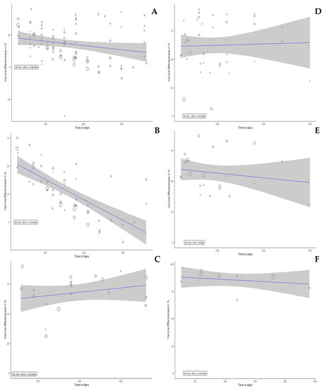 In the meta-regression analysis, the VE of full vaccination dose against any (Figure 3A), severe (Figure 3B), and symptomatic (Figure 3C) infections were significantly correlated with time (p < 0.001). The VE of booster vaccination dose against any (Figure 3D), severe (Figure 3E) and symptomatic (Figure 3F) infections were significantly correlated with time (p < 0.001). The correlation of VE (%) with time (day) was 49.45–0.08 per day (Figure 3A); 56.36–0.18 per day (Figure 3B); 64.81–0.02 per day (Figure 3C); 56.78–0.06 per day (Figure 3D); 53.58–0.04 per day (Figure 3E); 92.53–0.04 per day (Figure 3F).