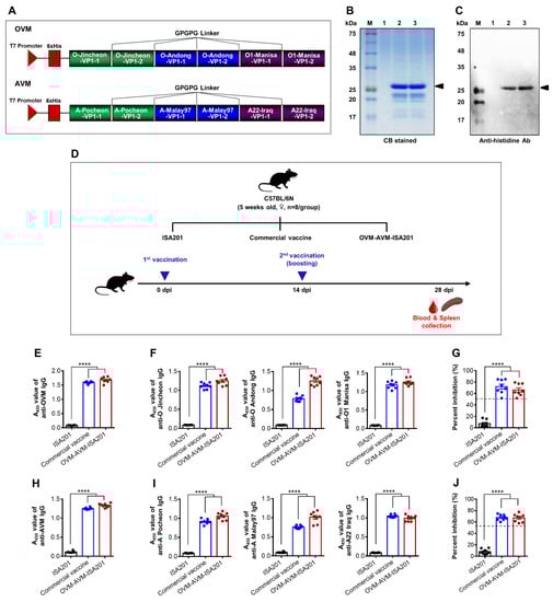 Schematic representation of the recombinant OVM and AVM constructs, purification and expression of OVM and AVM antigens, and OVM-AVM-ISA201-mediated humoral immune responses in mice. (A) Schematic depiction of the recombinant pHis parallel-OVM protein expression vector system. (B) SDS-PAGE of purified protein. Lanes: M, protein marker; 1, PBS; 2, purified OVM protein; 3, purified AVM protein (CB: Coomassie Blue). (C) Confirmation of OVM and AVM protein by Western blot analysis with the mouse anti-His monoclonal antibody. Lanes: M, protein marker; 1, PBS; 2, purified OVM protein; 3, purified AVM protein. C57BL/6 mice were divided into 3 groups (n = 8/group) and intramuscularly administered with 20 µg of OVM and 20 µg of AVM emulsified with ISA201. The positive control received (1/10 pig dose) commercial trivalent vaccine. The negative control received the same volume of ISA201. Immunization was performed twice at 0 and 14 days. Blood samples were collected for serological assays at 28 days post immunization (dpi). (D) Schematic depiction of mouse experiment strategy. (E) OVM-specific IgG titers. (F) O/Jincheon/SKR/2014-specific IgG titers (left panel), O/Andong/SKR/2010-specific IgG titers (middle panel), O1 Manisa/Turkey/69-specific IgG titers (right panel) were determined using indirect ELISA. (G) Serotype O SP-specific IgG titers were determined by O-type SP-specific solid phase blocking ELISA. (H) AVM-specific IgG titers. (I) A/Pocheon/KOR/2010-specific IgG titers (left panel), A/Malay/97-specific IgG titers (middle panel), A22/Iraq/24/64-specific total IgG titers (right panel) were determined using indirect ELISA. (J) Serotype A SP-specific IgG was determined by A SP-specific solid phase blocking ELISA. The values are presented as mean ± SE. Statistical analyses were performed using one-way ANOVA with Dunnett’s multiple comparisons test. **** p < 0.0001.