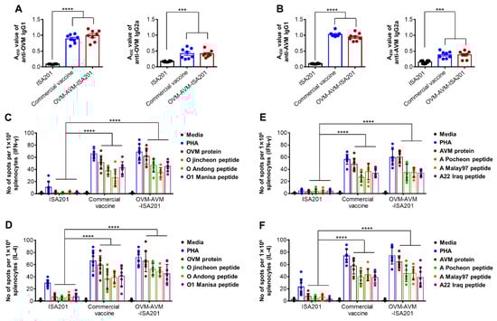 An effective vaccine candidate should ideally induce cell-mediated immune responses parallel with humoral immune responses []. To examine the OVM- and AVM-mediated cellular immune response, mice were immunized with OVM-AVM-ISA201, commercial vaccine, or ISA201 adjuvant alone, as depicted in Figure 1D. IFN-γ and IL-4 ELISPOT assays were performed using splenocytes from immunized mice. The cells were stimulated with OVM or AVM proteins or antigen-specific peptides for 48 h, and the secretion levels of IFN-γ, a cytokine involved in the activities of CTL, and IL-4, a cytokine involved in the production of vaccine-specific antibodies, were determined. The cells from mice immunized with OVM-AVM-ISA201 show significantly higher IFN-γ-secreting splenocytes following stimulation with OVM or AVM proteins or antigen-specific peptides than the ISA201 group. Notably, the IFN-γ response level in the OVM-AVM-ISA201 group was comparable to the commercial vaccine group (Figure 2C,E). Similarly, the cells from mice immunized with OVM-AVM-ISA201 exhibited a significantly higher level of IL-4 in response to stimulation with OVM and AVM proteins and antigen-specific peptides than those from the ISA201 group (Figure 2D,F). These results provide evidence that the OVM and AVM emulsified with ISA201 also induce T cell responses parallel to the effective antibody responses, which may be involved in regulating effective immune responses and may contribute to the development of broad cross-protective immunity.