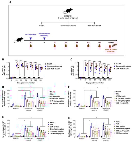 OVM-AVM-ISA201 induced long-lasting immunity in mice. As the strategy depicted in Figure 4A, mice (n = 5/group) were intramuscularly administered with 20 µg of OVM and 20 µg of AVM emulsified with ISA201. The positive control received (1/10 pig dose) commercial trivalent vaccine. The negative control received the same volume of ISA201. Vaccination was performed twice at 0 and 14 days. Blood samples were collected from the retro-orbital plexus on 0, 28, 56, 84, 112, 140, and 168 days post immunization (dpi) and serum was used for serological analysis. At 168 dpi, spleens were harvested for splenocyte isolation for CTL response evaluation. (A) Schematic depiction of mouse experiment strategy. (B) OVM-specific total IgG titers. (C) AVM-specific total IgG titers were determined by indirect ELISA. (D,F) Antigen-specific IFN-γ spot forming cells. (E,G) Antigen-specific IL-4 spot forming cells were enumerated by ELISPOT. PHA: Phytohaemagglutinin. The values are presented as mean ± SE. Statistical analyses were performed using two-way ANOVA with Dunnett’s multiple comparisons test. * p < 0.05, **** p < 0.0001.