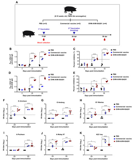 OVM and AVM emulsified with ISA201 were found to be effective antigens that induced high levels of FMDV-specific immune responses and conferred complete protection against lethal FMDV challenges in mice. To further test and validate the OVM- and AVM-induced effective immune responses in the native host, FMDV serotype O and A antibody-seronegative pigs were intramuscularly immunized twice with OVM-AVM-ISA201, the commercial vaccine, or PBS. Blood samples were collected at 0, 28, and 56 dpi and used for serological analyses (Figure 5A). Antigen-specific IgG titers in serum were measured using the OVM and AVM antigen-coated indirect ELISA. Pigs immunized with OVM-AVM-ISA201 developed significantly higher titers of anti-OVM and anti-AVM IgG levels at 28 and 56 dpi than the commercial vaccine group and PBS group (Figure 5B,D). FMDV serotype O- and A-specific anti-capsid antibody levels were measured using SP ELISA. All pigs immunized with OVM-AVM-ISA201 turned out to be FMDV serotype O and A SP antibody seropositive after booster vaccination and maintained up to 56 dpi (Figure 5C,E). The neutralizing antibody titers against O/Jincheon/SKR/2014, O/Andong/SKR/2010, O1 Manisa/Turkey/69, A/Malay/97, and A22/Iraq/24/64 showed good agreement with the ELISA results. The OVM-AVM-ISA201 group showed seroconverted virus-neutralizing antibodies against all 6 homologous virus strains at 56 dpi (Figure 5F–K).