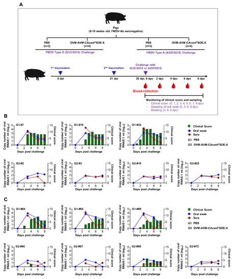 In vivo vaccination challenge experiments in target species is a golden standard for vaccine potency testing []. Therefore, the potency of OVM and AVM emulsified with CAvant®SOE-X (OVM-AVM-CAvant®SOE-X) was assessed in the target animal challenge model. To this end, FMDV serotype O and A antibody-seronegative pigs were intramuscularly immunized twice with OVM-AVM-CAvant®SOE-X or PBS. The immunized pigs were challenged with 105 TCID50 of virulent O/Jincheon/SKR/2014 or A/SKR/GP/2018 virus at 28 dpi (Figure 6A). All pigs immunized with PBS showed typical signs of FMDV and a high level of viremia titers in serum and oral swabs upon O/Jincheon/SKR/2014 or A/SKR/GP/2018 (Figure 6B,C; upper panels). Importantly, animals immunized with OVM-AVM-CAvant®SOE-X were fully protected from the O/Jincheon/SKR/2014 FMDV challenge (Figure 6B lower panels). One of four animals (animal #68) showed signs of FMDV upon infection by A/SKR/GP/2018 (Figure 6C lower panels). However, pigs immunized with OVM-AVM-CAvant®SOE-X showed detectable levels of persistent O/Jincheon/SKR/2014 or A/SKR/GP/2018 viremia in both oral swabs and saliva up to 8 dpc (Figure 6B,C). These results demonstrate that OVM and AVM emulsified with CAvant®SOE-X provides complete clinical protection against homologous virus and partial clinical protection against heterologous virus.