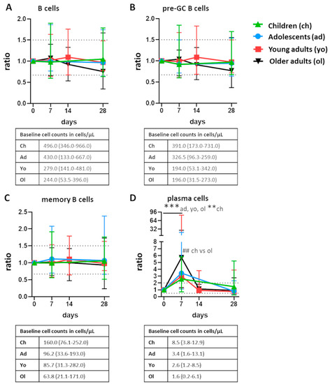 Total B cells, pre-germinal center B cells, and memory B cells remained relatively stable and did not show any consistent fluctuations over time following vaccination. However, in all participants, plasma cells underwent significant expansion between baseline and day 7 (p ≤ 0.01 for children, and p ≤ 0.001 for adolescents and the adult cohorts, Figure 1). The magnitude of this expansion was highly similar in children, adolescents, and young adults (ratio to baseline: 2.6–3.4) and was significantly higher in older adults compared with children (ratio: 2.6 in children vs. 5.7 in older adults, p ≤ 0.01). Total plasma cell numbers returned to baseline at day 14 or, if day 14 was not measured, day 28 (p ≤ 0.001 for adolescents, young and older adults; in the children cohort, plasma cell counts were still slightly elevated at day 28). Thus, the expansion of plasma cells 7 days postvaccination was the most prominent change in all age groups.
