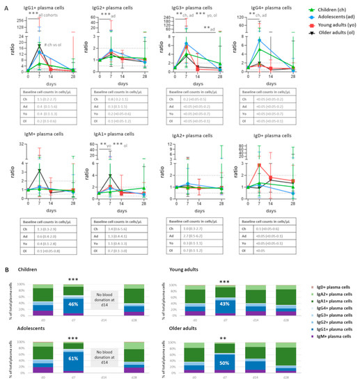 Cell expansion at day 7 was not equally pronounced in all plasma cell subsets. It was most prominent in IgG1+ plasma cells (ratio to baseline: 5.7–17.6, depending on cohort, p ≤ 0.001 in all cohorts, with a higher increase in older adults compared with children, p < 0.05). This was followed by IgG3+ plasma cells (ratio: 3.6–6.5, p ≤ 0.01 in children and adolescents, and p ≤ 0.001 in young and older adults, Figure 2A). IgG4+ plasma cells were significantly increased in children and adolescents (ratio: 5.1 and 7.2, respectively, p ≤ 0.01). IgG2+ plasma cells were significantly increased in adolescents only (ratio: 1.8, p ≤ 0.001). IgA1+ plasma cells were significantly increased in both adult cohorts (ratio: 2.1 and 3.9 in younger and older adults, p ≤ 0.01 and p ≤ 0.001, respectively). Although IgM+ plasma cells seemed to expand at day 7 in older adults, there was a large variation between individuals and the difference was not statistically significant.