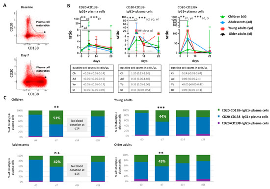 Despite individual changes in response patterns between the cohorts, IgG1+ plasma cells were the most expanded subset. They constituted between 43% (young adults) and 61% (adolescents) of all plasma cells at the peak of expansion, while only at most 18% at baseline (Figure 2B). Although the ratio (to baseline) of plasma cells was often higher in adults than in children, children had higher baseline IgG1+ plasma cell numbers, and also higher IgG1+ plasma cell numbers at day 7 (median cell count at day 7: 7.64 cells/µL in children vs. 3.81 cells/µL in older adults, ns). Thus, the expansion of IgG1+ plasma cells was the most prominent in all cohorts. Both an increase over baseline (ratio) and in absolute cell numbers were observed.
