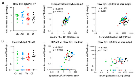 Previous studies on influenza have found that Ag-specific plasma cells generated after vaccination represent up to 80% of the total plasma cell pool [30,31]. Therefore, we correlated numbers of total plasma cells (non-Ag-specific) as determined by flow cytometry to those specific for the vaccine components as determined by ELISpot analysis. In our Tdap-IPV vaccination study, the absolute increase in IgG and IgA plasma cell numbers from baseline to day 7 and the number of vaccine-specific IgG- and IgA-producing plasma cells at day 7 showed a positive correlation, indicating that the increase in total IgG and IgA plasma cells is explained by the increase in Ag-specific IgG and IgA plasma cells (IgG: r = 0.59, p < 0.0001; IgA: r = 0.60, p < 0.0001) (Figure 5).