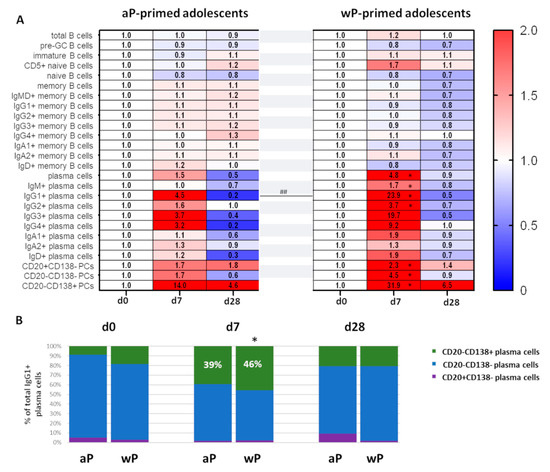We have recently shown that aP booster vaccination in (wP-primed) adults triggers several cellular changes, of which the expansion of (predominantly) IgG1+ plasma cells at day 7 is most prominent [33]. Now, we set out to determine whether the same types of changes occur in vaccinated individuals, irrespective of age and primary vaccination background.