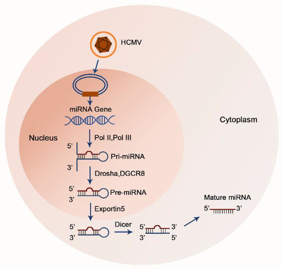 A sketch of HCMV-encoded miRNA biosynthesis model. Mature miRNAs are generated from hairpin secondary structures that arise from longer RNA polymerase II or polymerase III transcripts. In the nucleus, primary (pri-) miRNAs are cleaved into precursor (pre-) miRNAs via the microprocessor complex, consisting of DGCR8 and the ribonuclease Drosha. Next, pre-miRNAs are transported from the nucleus to the cytoplasm. After reaching the cytoplasm, pre-miRNAs are recognized and processed into their mature form by another RNase III, Dicer.