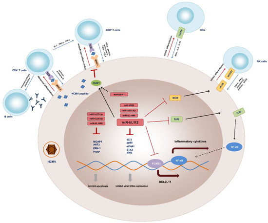 During the latent stage, HCMV encodes miRNAs to inhibit its own DNA synthesis in infected cells and to reduce the production of inflammatory mediators synthesized by host cells mainly through directly suppressing their transcription or interfering with the signaling pathways that stimulate their production, thereby enabling long-term coexistence in host cells. Moreover, HCMV-encoded miRNAs also blunt the host immune response by weakening immune cells (Figure 2).