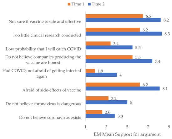 At Time 1, the most supported arguments against vaccination were “Afraid of side effects” and “Too little research conducted” (similar level with Bonferroni p > 0.999), shortly followed by “Not sure if vaccine is safe and effective” (p = 0.014) and then “Don’t believe companies producing the vaccines are honest” (lower with p < 0.001), the remaining arguments much less supported (all p < 0.001). A similar structure was seen at Time 2, the most supported arguments being “Afraid of side effects”, “Not sure if vaccine is safe and effective”, and “Too little clinical research conducted” (similar with Bonferroni p > 0.999), followed by “Don’t believe companies producing the vaccine are honest” (lower with p < 0.001) and then the remaining arguments. Descriptive statistics can be found in Table 2.
