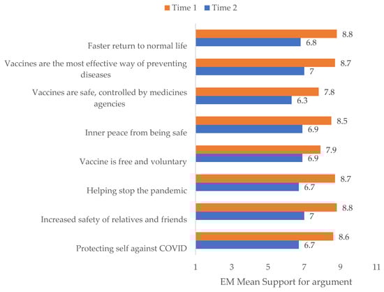 Conversely, it turned out that support for all the reasons to get vaccinated was significantly lower at Time 2 than at Time 1 in the pro-vaccine sample (F(1388) = 573.765, p < 0.001, η2p = 0.597); all pairwise comparisons p < 0.001 (Bonferroni corrected). Results are presented in Table 3 and Figure 2.