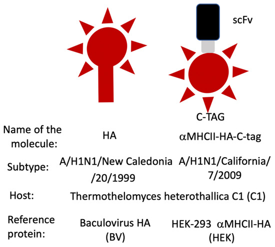 Schematic representation of the two different types of influenza HA immunogens produced in this study in the filamentous fungus Thermothelomyces heterothallica C1. The red structure denotes the influenza hemagglutinin (HA). The black box represents the scFv (single-chain variable fragment). The gray box represents the glycine-rich linker connecting the scFv with the HA. C-tag denotes a four amino acid tag placed in the C-terminus of the fusion protein.