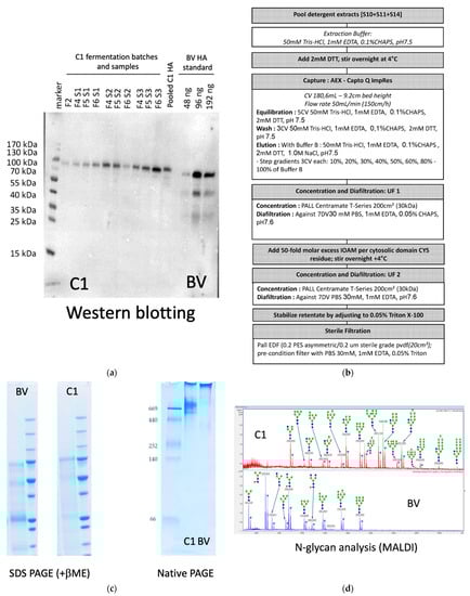 A downstream process was developed to extract the C1-HA (New Caledonia/20/99) protein from the cell mass (Figure 2b). The downstream process led to extraction of the target protein with a purity of ca. 80–90% as revealed by denaturing SDS PAGE under reducing conditions (Figure 2c). Native PAGE showed that most of the HA was present as a high molecular weight product consistent with homotrimers of HA0 like the in the control BV-HA (New Caledonia/20/99).