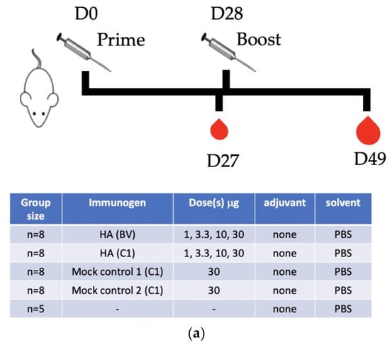 The assessment of the immunogenicity of the C1-produced (New Caledonia/20/99) mice (Figure 3a) was conducted at Sanofi Pasteur. Balb/c By1 mice (Charles River, Cambridge, MA, USA) aged 9 weeks +/− 3 days at day 0 (D0) were used. Mice were kept under SPF conditions in an animal facility meeting L2 biosafety requirements. Mice were fed with granulated food (M20, SDS, Dietex, St. Gratien, France) and tap water ad libitum. The mice were acclimated to their designed housing for 5 days before D0. On D0 the mice received 2 × 50 μL intramuscular injection into the quadriceps. Mice were injected either with PBS (5 animals each), two different batches of C1 mock protein samples that were obtained from non-transformed parental strains, and which have undergone the same purification process as above (5 animals each), or with increasing dosage (1, 3.33, 10, and 30 μg per dose of either C1-produced or Baculovirus expression system produced HA (New Caledonia/20/99) (8 animals each)). On D27 the mice were weighed, and blood was sampled from the submandibular vein under isoflurane anesthesia. On D28 the mice again received the same injection as on day 1 (boost). On D49 the mice were again weighed, anesthetized by intraperitoneal administration of 200 μL of Imalgene (1.6 mg of ketamine) and Rompun (0.32 mg xylazine) and exsanguinated from the carotid section. The sera were collected and stored at −20 °C until analysis.