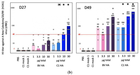 To assess the immunogenicity of C1-HA (New Caledonia/20/99), a mouse study was conducted (Figure 3a). In brief, mice were immunized using a prime-boost regime 28 days apart with various doses of unadjuvanted C1-HA (New Caledonia/20/99), or BV-HA (New Caledonia/20/99). PBS and mock protein samples from the parental strains were used as controls (Figure 3b). HI antibodies titers present in mouse sera on days 27 (left panel, post-prime) and 49 (right panel, 21 days post-boost) were assessed. HI antibodies were readily detected after prime immunization in the high dose protein groups (10 and 30 µg dose), but only the group immunized with C1-HA (New Caledonia/20/99) had a significant number of animals consistently showing HI titers of ≥40 predictive of protection. This was particularly the case in the group receiving 30 µg of C1-HA (New Caledonia/20/99) showing HI titers ≥80. Increased HI responses were observed on samples on day 49, consistent with the boost response. Notably, HI titers after boost were consistently higher in groups immunized with C1-HA (New Caledonia/20/99) compared to groups immunized with identical amounts of BV-HA (New Caledonia/20/99). Overall, HI titers were statistically higher in the groups immunized with C1-HA (New Caledonia/20/99) than in groups immunized with identical amounts of BV-HA (New Caledonia/20/99) in the 3.3- to 30-µg dose range. These results suggest that the C1-produced HA is immunogenic and showed an improvement in neutralizing HI responses compared to those derived from the Baculovirus-based expression system.