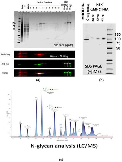 Here, the αMHCII-targeted HA1 fragment was expressed in the C1 system (C1 αMHCII-HA (California/7/2009) C-tag) and compared to the same product without the four amino acid C-tag produced in human embryonic kidney HEK-293 cells (HEK αMHCII-HA (California/7/2009). The recombinant αMHCII-HA-C-tag/αMHCII-HA proteins were readily expressed in both systems and could be detected by antibodies directed against HA (California/7/2009) and the C-tag (where applicable). The C1 αMHCII-HA (California/7/2009) C-tag protein was produced at 300–600 mg/L and it was purified using the C-tag as the affinity ligand (Figure 4b). Analysis of the N-glycan profile present on the C1 αMHCII-HA (California/7/2009) C-tag showed the typical C1 N-glycan forms similar to the C1-produced full-length HA (New Caledonia/20/99) products.