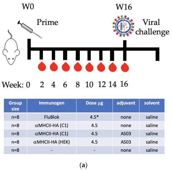 The assessment of the immunogenicity of the C1-produced αMHCII-HA (California/7/2009) in mice (Figure 5a) was conducted at the at Oslo University Hospital, Norway. Six-to-eight-week-old female BALB/c mice (Janvier, le Genest-Saint-Isle, France) were housed under minimal disease conditions. Proteins dissolved in saline, or formulated with AS03 (GlaxoSmithKline, GSK, Uxbridge, UK), were injected intramuscularly (i.m.) into each quadriceps. Flublok Quadrivalent (#90686, Sanofi Pasteur, Orlando, FL, USA) referred to shortly as Flublok was used as a control vaccine. Blood samples were collected biweekly from mice by puncture of the saphenous vein, and sera isolated by two successive centrifugations for 5 min at 13,000 rpm. On week 16, groups of anaesthetized mice were infected intranasally with 5 × LD50 of influenza A H1N1 (California/7/2009) in 10 µL per nostril. Mice were monitored for weight loss with an endpoint of 20% weight reduction, as required by the Norwegian Food Authority. Mice reaching the >20% weight loss were euthanized by cervical dislocation.
