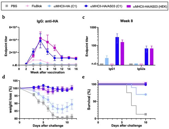 In order to evaluate immunogenicity, mice (n = 8/group) were vaccinated once with αMHCII-HA produced in either the C1 or HEK293E expression systems (Figure 5a) and compared to responses elicited by the licensed quadrivalent vaccine Flublok produced in baculovirus that contains the same HA (California/7/2009) [21]. C1 αMHCII-HA (California/7/2009)-C-tag and HEK αMHCII-HA (California/7/2009) proteins were formulated to contain the equivalent of 4.5 μg of HA in absence or presence of the AS03 adjuvant. Sera from the vaccinated mice collected longitudinally every 2 weeks from the second week post-vaccination until week 16 were evaluated for anti-HA (California/7/2009) IgG responses by ELISA. Strong and comparable anti-HA (California/7/2009) IgG responses were observed in mice vaccinated with the C1-derived and HEK293-derived αMHCII-HA-C-tag or αMHCII-HA proteins, respectively, when formulated with AS03 adjuvant. Anti-IgG levels were significantly higher than those elicited by Flublok, the latter being above the baseline only in serum samples from weeks 4 and 6. In contrast, sera from mice vaccinated with the C1 αMHCII-HA (California/7/2009)-C-tag without adjuvant showed weak responses only detected on samples from week 6 post-vaccination. These trends were also observed when evaluating the IgG1 and IgG2a subclasses in sera from 8 weeks post-vaccination (Figure 5c). Both adjuvanted αMHCII-HA formulations elicited strong IgG1 and IgG2a responses, whereas samples from mice receiving either Flublok or non-adjuvanted αMHCII-HA showed detectable IgG1 responses but negligible IgG2 responses.