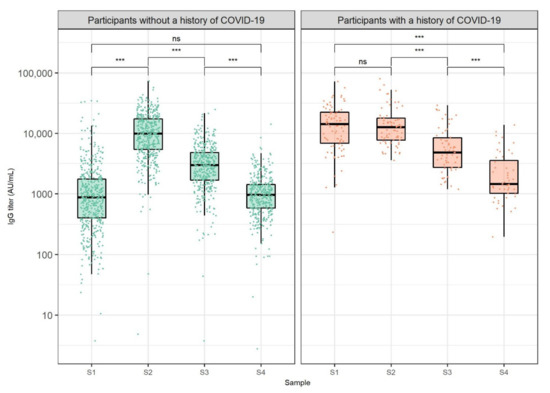 Anti-SARS-CoV-2 IgG titers 3 weeks after the first dose (S1) and 1 (S2), 3 (S3), and 6 months (S4) after the second dose of BNT162b2 vaccine against COVID-19, stratified by pre-vaccination COVID-19 status. The boxes show the median and interquartile range of the distribution, while the whiskers extend to the minimum and maximum nonoutlier values of the distribution. Points denote individual participants. The y-axis is logarithmically scaled. Sera of participants obtained after COVID-19 onset were not included. ns: non-significant, *** p < 0.001 (Wilcoxon signed-rank test, p-values adjusted for multiple comparisons with the Bonferroni method).