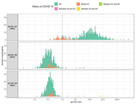 Histogram of ratios of SARS-CoV-2 IgG levels measured: (A) 1 month after the second BNT162b2 vaccine dose (S2) and 3 weeks after the first vaccine dose (S1) (N = 524); (B) 3 months after the second vaccine dose (S3) and 1 month after the second vaccine dose (N = 479); (C) 6 months after the second vaccine dose (S4) and 3 months after the second vaccine dose (N = 406). Participants are colored according to their history of COVID-19. The X-axis is logarithmically scaled for increased resolution. The dotted line marks an IgG titer ratio of 1 which corresponds to no changes in IgG titer between the respective timepoints. Participants shown left of the dotted line exhibited a decrease in IgG titers between the respective timepoints. Participants shown right of the dotted line showed an increase in IgG titers between the respective timepoints.