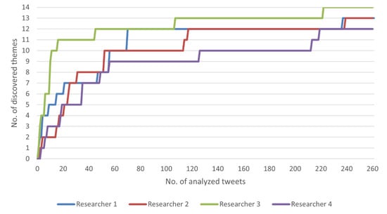 During the data analysis, data saturation was assessed retrospectively in two meetings using the methodology suggested by Guest et al. []. Figure 1 shows the number of new themes identified by the number of tweets analyzed for each researcher. As can be seen in the figure, there was only marginal information gain (2 out of 14 themes) after approximately 60 tweets has been analyzed and potentially discovering one more theme would cost approximately a thousand new tweets to be analyzed. In the second meeting, all researchers agreed that further sampling was not required and not efficient enough given the small likelihood of discovering new information.