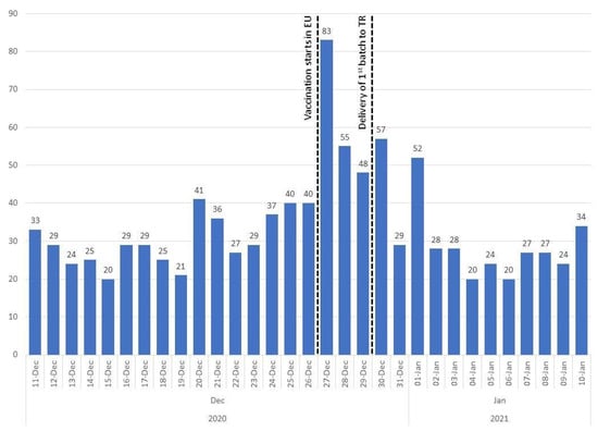 Daily numbers of tweets are shown in Figure 2. The median number of included tweets per day was 29.0 during 11–29 December which corresponds to the time before the arrival of the first group of vaccines to Turkey.