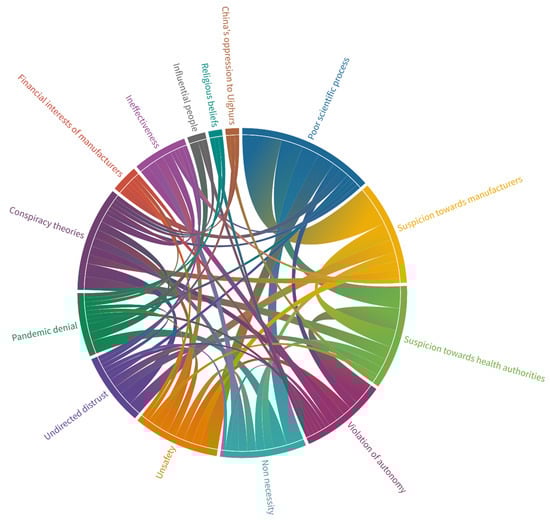 Seventy-one tweets (34.2%) were coded for more than one theme. The co-occurrence of themes among those tweets is visualized in Figure 3. Most commonly, the “poor scientific process” theme accompanied “suspicion towards manufacturers” (n = 9) and “suspicion towards health authorities” (n = 5).