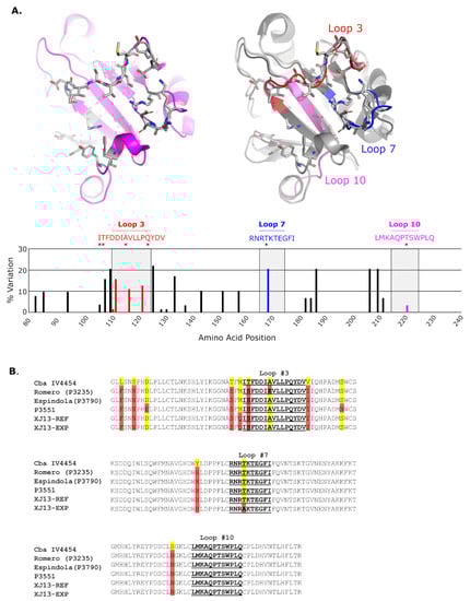 Strategy for the generation of Junín virus (JUNV)-derived peptide antigens for expression on hepatitis B virus core-like particles. (A) Crystal structures of Machupo virus (MACV) GP1 and JUNV GP1. The X-ray structure of MACV GP1 in complex with transferrin receptor 1 (TfR1) (PDB:3KAS [11]), in which the TfR1 atoms were removed, is represented in the left panel. GP1 is colored pink except for the residues making contact with TfR1 in the complex, which are shown as sticks (color coded according to the atom type: carbon, light grey; nitrogen, blue; oxygen, red; sulfur, yellow). The right panel shows an overlay of the same structure with JUNV GP1 (extracted from the X-ray structure of JUNV GP1 in complex with Fab GD01, PDB:5EN2 [12]). The MACV GP1 structure is represented with its interacting residues as sticks, as in the left panel, except that the rest of the protein is in grey. The JUNV GP1 structure is shown only as ribbons in which the three loops tested are colored, as indicated. Note that Loop 3 extends all along the interaction surface and could constitute a potential linear epitope eliciting neutralizing antibodies. These two panels were prepared with the PyMOL Molecular Graphics System (Version 2.1, Schrödinger). Conservation of the amino acids in and around the respective loops (amino acid positions 80–240) are shown based on an alignment of the sequences of 63 unique naturally occurring JUNV isolates available in GenBank (Figure S2). The positions of the respective loops are boxed and bars indicating the frequency of variable amino acids within these regions are shown in color. The corresponding peptide sequences are shown, and asterisks indicate these variable sites. (B) Sequence alignment for JUNV strains used in this study. Details of the sequence alignment are shown for the region from amino acid 80 to 240 for the CbaIV4454 strain (GenBank: DQ272266), against which the peptide sequences were designed, and the other strains used for the testing of cross-neutralization in this study. Sequences corresponding to the selected peptide loops are indicated in bold text and underlined. Sequences for strains Romero (GenBank: JN801476), Espindola (GenBank: DQ854739), and P3551 (GenBank: MZ408913, this study), and both a reference sequence for strain XJ13 (XJ13-REF; GenBank: FJ805378) and the sequence determined based on the XJ13 isolate available in our laboratory (XJ13-EXP; GenBank: MZ408914) are shown. Sites showing amino acid variation are highlighted in color, with the amino acid observed in strain CbaIV4454 shown in yellow and all other variants shown in red. *: “asterisks indicate these variable sites“.