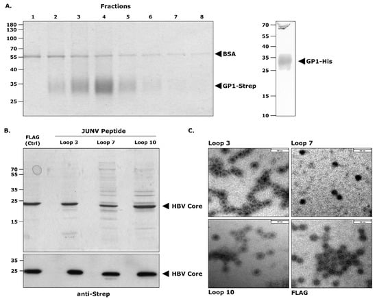 Recombinant JUNV GP1 (rGP1) was expressed in mammalian cells with either a twin Strep tag (GP1-Strep) or a 6 × His tag (GP1-His) at the C-terminus. Both antigens were purified via affinity chromatography to >90% purity, as assessed by Coomassie staining (Figure 2A). Similarly, HBV-CLPs containing JUNV hTfR1-interacting loops (i.e., Loop 3, Loop 7, and Loop 10) or a FLAG tag at the c/e1 immunodominant epitope could be affinity purified to >80% purity based on Coomassie staining (Figure 2B, upper panel). Further, the bands corresponding to the size of the HBV core protein reacted with a Strep tag-specific antibody, confirming their identity (Figure 2B, lower panel). The particulate nature of the CLP preparations was verified by electron microscopy, which demonstrated the presence of HBV-CLPs approximately 40 nm in diameter (Figure 2C).