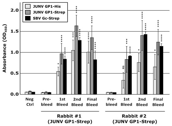 Development of antibodies following vaccination with recombinant Junín virus (JUNV) GP1. Blood samples were collected from rabbits either before immunization or 14 days after each of 3 immunizations with 80 ug of recombinant JUNV GP1-Strep. A sample from another rabbit unrelated to this study served as an additional control (Neg Ctrl). Serum fractions were diluted 1:10 for use in an indirect ELISA assay with JUNV GP1-Strep, JUNV-GP1-His, or Schmallenberg virus Gc amino-Strep (SBV-Gc-Strep) as the target antigen, as indicated. Data from at least two independent experiments are represented and the results of a one-way ANOVA comparing samples post-vaccination to the respective pre-immunization samples are shown (ns not significant; * p ≤ 0.05; *** p ≤ 0.001; **** p ≤ 0.0001).