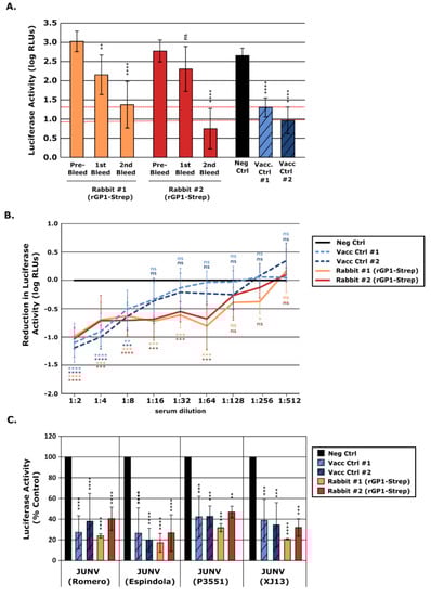 In light of the robust antibody responses in ELISA, we further evaluated the neutralizing activity of the antibodies raised against rGP1-Strep. This was first done using trVLPs to allow testing under BSL-1/2 conditions (i.e., without the need for infectious virus), and also to allow the use of GPs from different JUNV strains to assess the breadth of neutralization [21]. When used undiluted, sera generated against rGP1 already showed evidence of significant levels of neutralization for one animal following the priming immunization (i.e., after the first bleed), which then increased to become significant for both animals following additional immunization (i.e., after the second bleed) (Figure 4A). Titration of the serum obtained after the second boost (i.e., after the third/final bleed) (Figure 4B) showed neutralizing antibody levels that were sufficient to produce statistically significant reductions in the reporter activity out to a 1:64 dilution. These levels were higher than for positive control samples from long-term human vaccinees (sera collected 9 years post-vaccination), which were only significant up to a dilution of 1:8. Further, similar to human Candid#1 vaccinees, the rGP1 rabbit sera showed efficient neutralization of trVLPs containing the GPs of 4 different unrelated JUNV strains, i.e., Romero, Espindola, P3551, and XJ13 (Figure 4C).