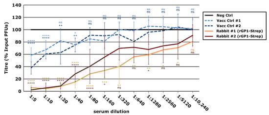 Assessment of neutralizing antibody development following vaccination with recombinant Junín virus (JUNV) GP1 based on the plaque reduction neutralization test. JUNV (strain Cba IV4454) diluted to 103 pfu/mL was mixed 1:1 with serum from rabbits vaccinated with recombinant JUNV GP1-Strep or from a naïve rabbit. Serum from human Candid#1 vaccinees (Vacc Ctrl) or a control pooled human AB serum served as additional controls. Samples were incubated for 1 h at 37 °C before 100 μL were used to infect Vero cells for analysis using plaque assay. Values are expressed as a percentage of the number of plaques in samples treated with the control serum (i.e., naïve rabbit or human AB serum). Data from at least two independent experiments are represented and the results of a one-way ANOVA comparison of experimental samples with the control antibody are shown (ns not significant; * p ≤ 0.05; ** p ≤ 0.01; *** p ≤ 0.001; **** p ≤ 0.0001).