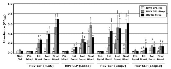 Adult 10-week-old (approximately 2 kg) New Zealand white rabbits obtained from the breeding facility of the Friedrich-Loeffler-Institut were immunized three times with either JUNV GP1-Strep or HBV-CLPs expressing one of the three JUNV-derived peptide sequences (i.e., Loop 3, Loop 7, or Loop 10) or the control peptide (FLAG). Each immunization consisted of 20 µg of protein in GERBU Adjuvant P (Gerbu Biotech) at each of 4 injection sites (i.e., 80 µg of antigen per animal). Immunizations were spaced 21–42 days apart, with samples collected 14 days after each immunization. Blood was collected under anesthesia from the jugular vein. Serum was prepared from whole blood by allowing the samples to clot at room temperature followed by centrifugation at 1500× g for 10 min.