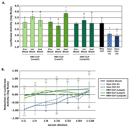 Assessment of neutralizing antibody development following vaccination with Hepatitis B virus core-like particles (HBV-CLPs) expressing Junín virus (JUNV)-derived peptides using neutralization of transcription and replication-competent virus-like particles (trVLPs). trVLPs containing the GP of JUNV (strain Romero) were incubated 1:1 (i.e., final 1:2 dilution) with serum from rabbits vaccinated with HBV-CLPs expressing 1 of 3 JUNV-derived peptides (i.e., Loop 3, Loop 7, Loop 10) collected before or during the immunization process, as indicated. Serum from human Candid#1 vaccinees (Vacc Ctrl) or a control pooled human AB serum served as additional controls. Samples were incubated for 2 h at 37 °C before being used to infect Huh7 cells pre-transfected with plasmids expressing JUNV NP and L. After 48 h, these cells were harvested and their nanoluciferase activity measured (as a measure of viral RNA synthesis). Data from at least two independent experiments are represented and the results of a one-way ANOVA comparison with control antibody-treated samples are shown. (B) Titration of neutralizing antibodies. Neutralization of trVLPs was performed as in (A) using the serum collected after the final immunization. The sera were prepared as a 1:2 dilution series before being added to trVLPs to achieve a dilution range from 1:2 to 1:128. Data from four independent experiments are represented and are shown relative to values obtained with the negative control sera (i.e., HBV-CLP-FLAG or human AB serum). The results of a one-way ANOVA comparing samples to the negative control serum are shown (ns not significant; * p ≤ 0.05; ** p ≤ 0.01; *** p ≤ 0.001; **** p ≤ 0.0001).