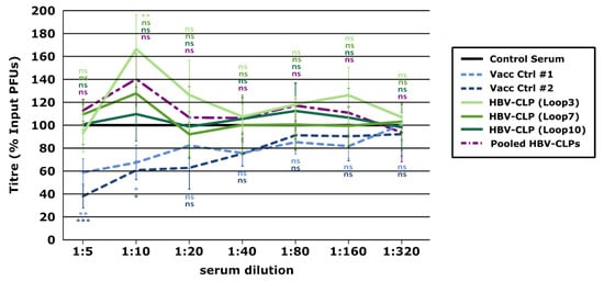 Assessment of neutralizing antibody development following vaccination with hepatitis B virus core-like particles (HBV-CLPs) expressing Junín virus (JUNV)-derived peptides based on the plaque reduction neutralization test. JUNV (strain Cba IV4454) diluted to 103 pfu/mL was mixed 1:1 with serum from rabbits vaccinated with 1 of the HBV-CLPs indicated (Loop 3, Loop 7, or Loop 10), a pooled mixture of the sera from these rabbits, or serum from a rabbit that received a control HBV-CLP containing a FLAG peptide. Serum from human Candid#1 vaccinees (Vacc Ctrl) or a control pooled human AB serum served as additional controls. Samples were incubated for 1 h at 37 °C before 100 μL were used to infect Vero cells for analysis using the plaque assay. Values are expressed as a percentage of the number of plaques in samples treated with the control serum (i.e., HBV-CLP-FLAG or human AB serum). Data from at least two independent experiments are represented and the results of a one-way ANOVA comparison of the experimental samples with the control antibody are shown (ns not significant; * p ≤ 0.05; ** p ≤ 0.01; *** p ≤ 0.001).
