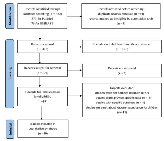 The original records were selected based on the following inclusion criteria: (1) studies involved acceptance of COVID-19 vaccination for children; (2) studies with adult participants (>18 years of age) who were parents or guardians of minors; (3) studies provide specific survey data for pooling. Exclusion criteria were as follows: (1) non-primary documents: reviews, meta-analysis, editorials and other articles; (2) studies with subgroup-specific samples (e.g., healthcare workers or patients); (3) duplicate studies or databases.